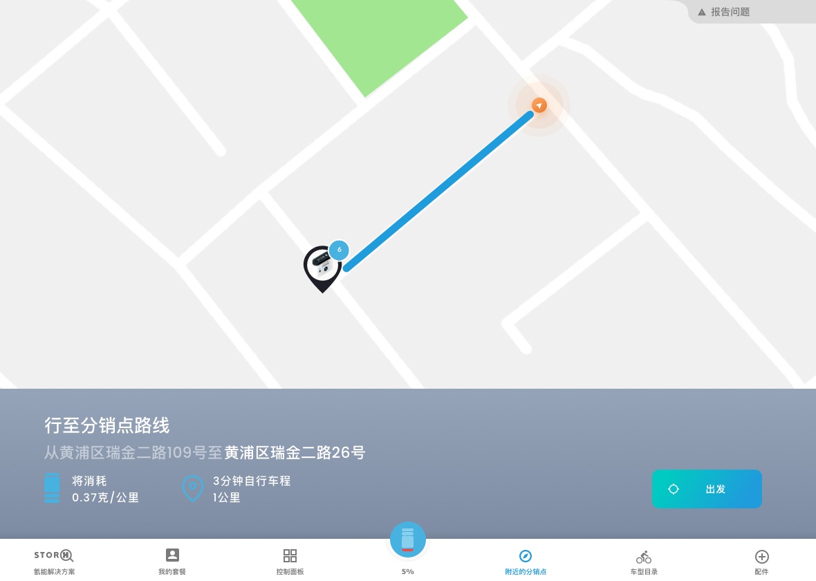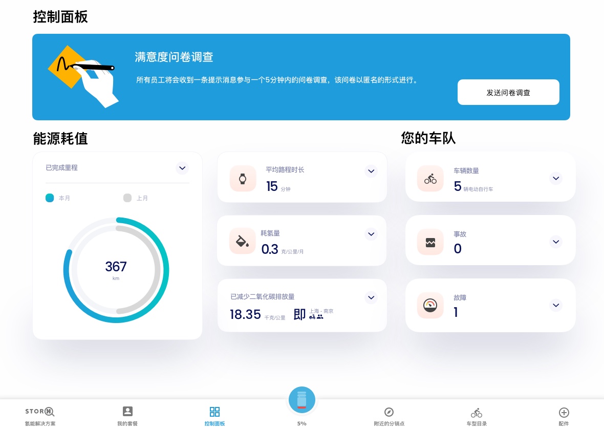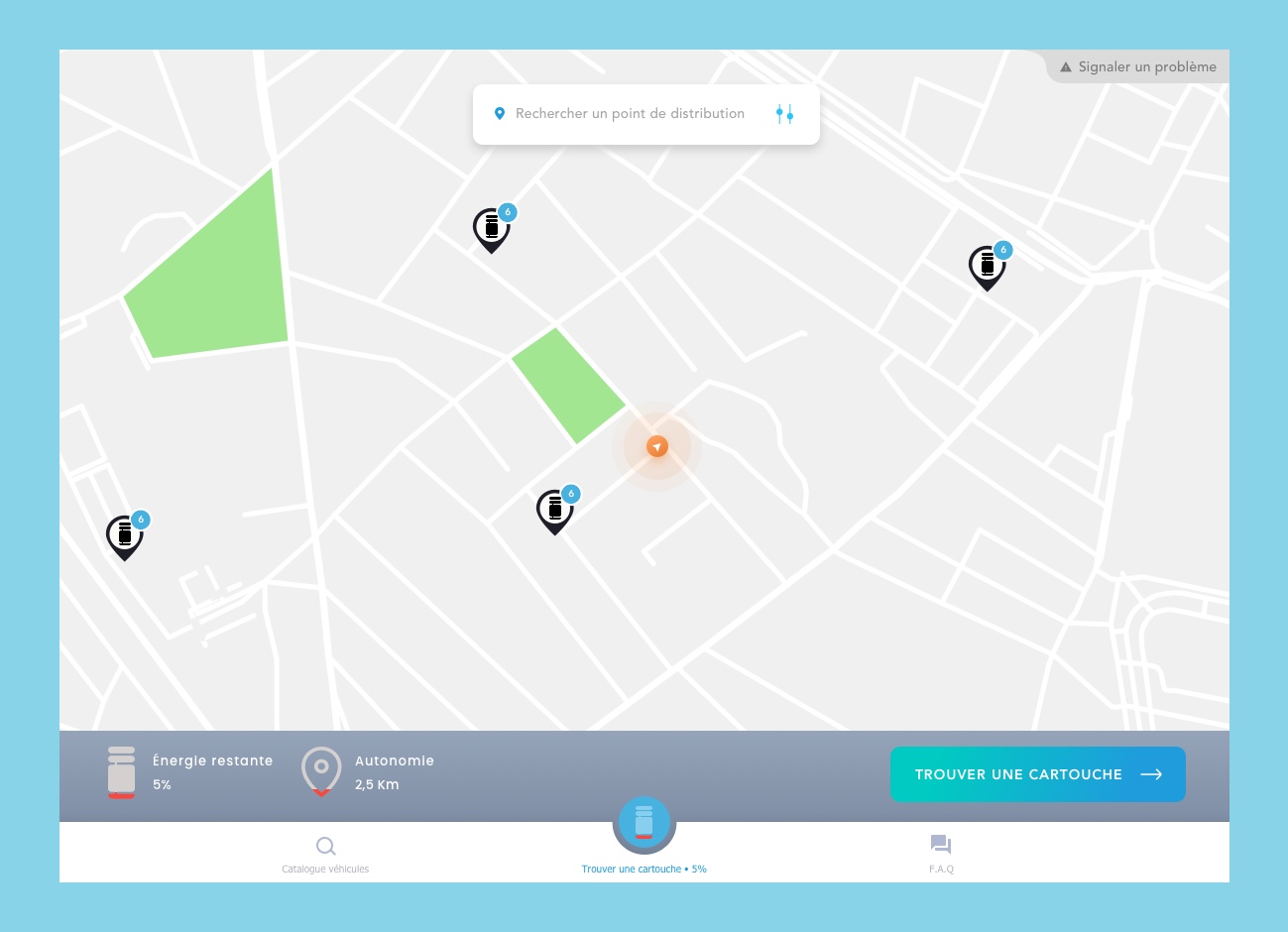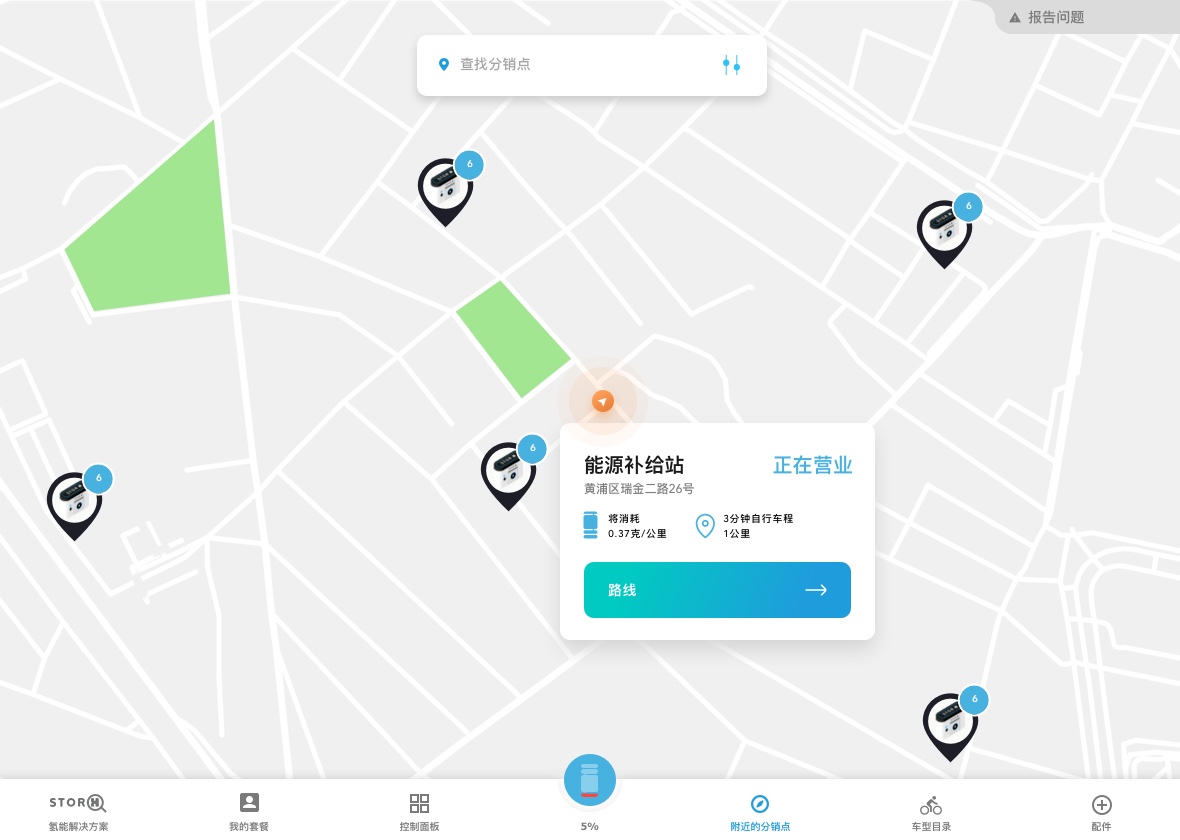 Using Stor-h's removable hydrogen tank technology, employees can exchange their empty hydrogen tank for a new full one. To do so, they can use the map and GPS functionalities in order to search for stations around them.