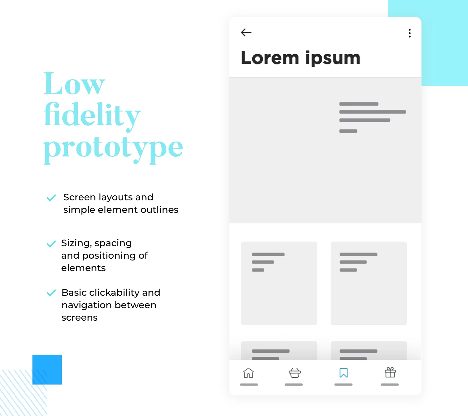 A low-fidelity prototype generally consists of a bare-bones version of the final product. It typically contains the following: